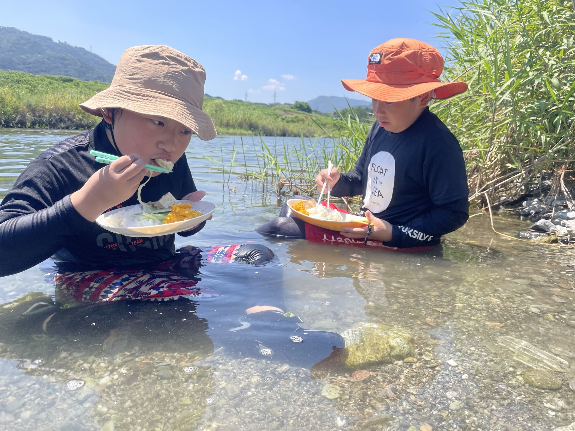 お昼ご飯は川の中で食べたり、テントの下でたべたり、みんなそれぞれモリモリたべていました!動いた後のご飯は絶品でした♪