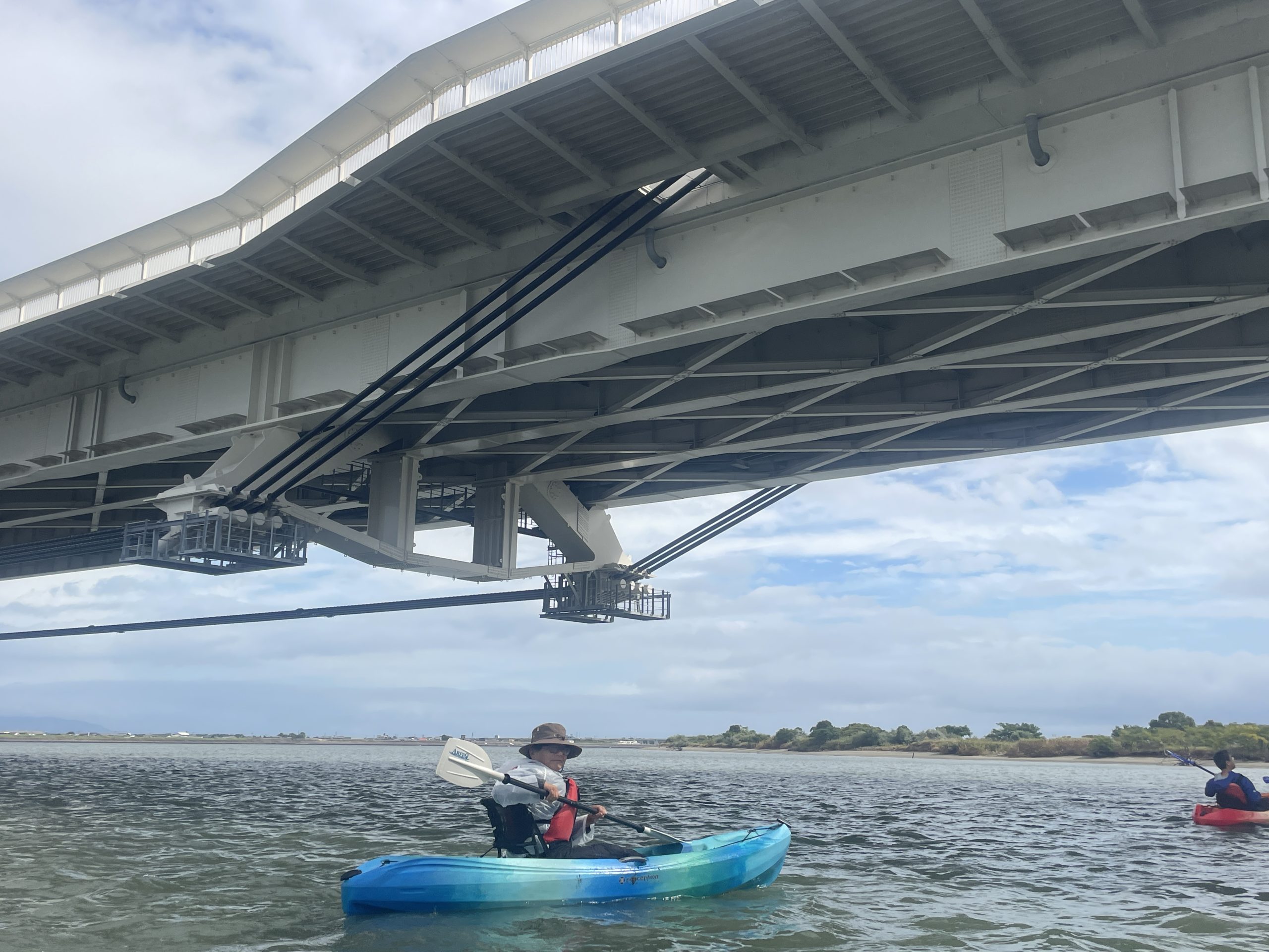 大橋を下から見るとなんてでかいんや!!!しかも、そこだけ風が強くて、カヌーで進むのは一苦労。