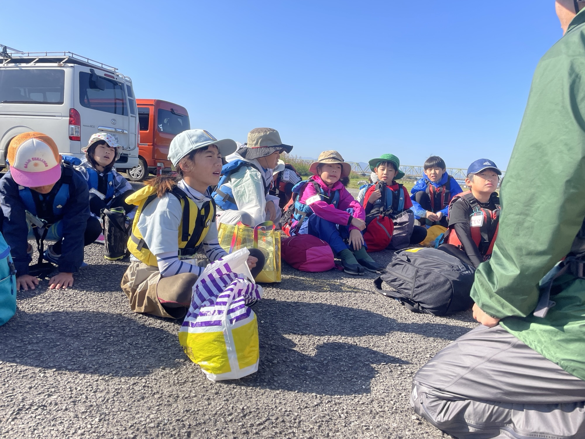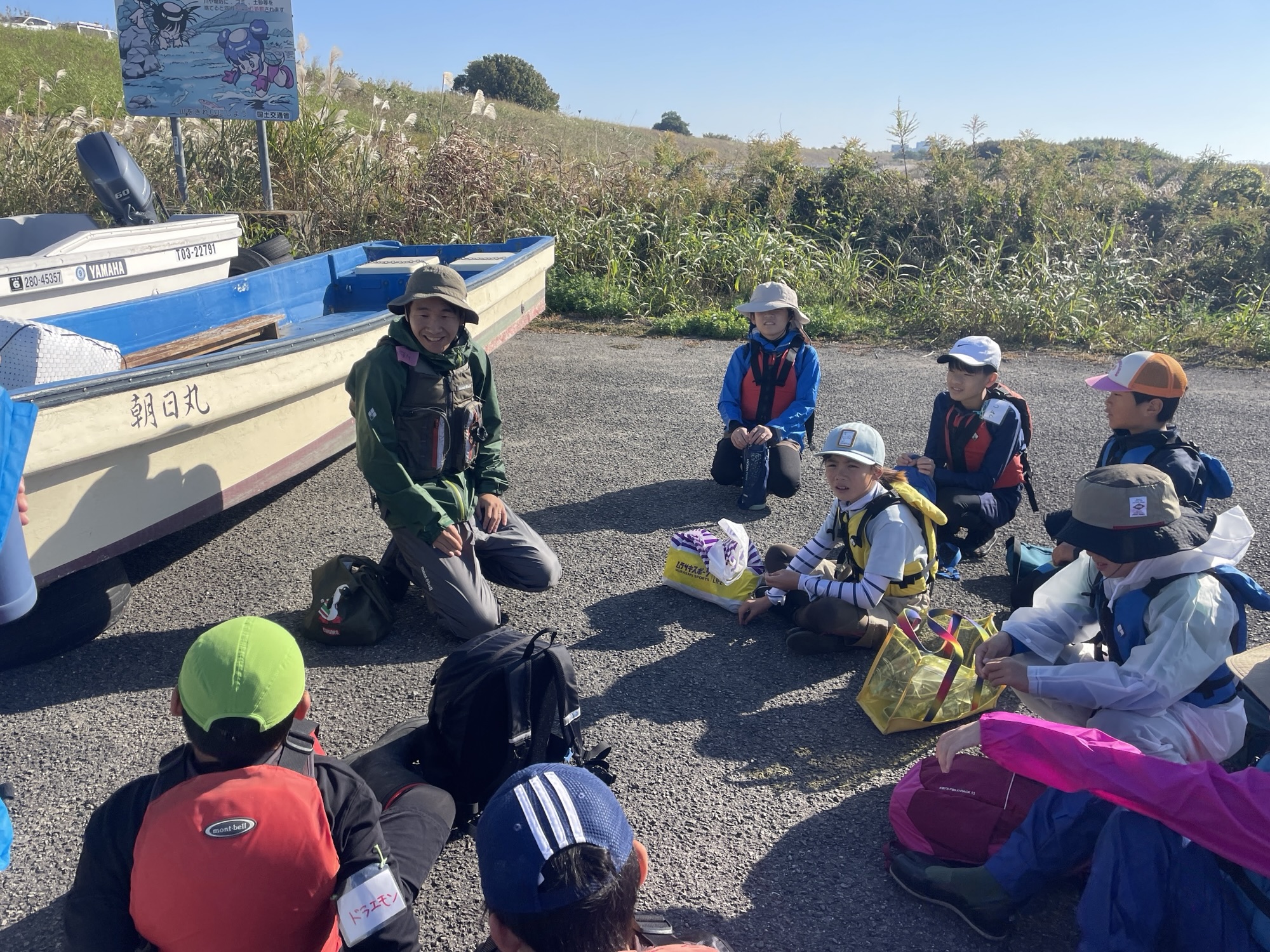 まず、船着場に集合して、船に乗って吉野川の中へ出発!
