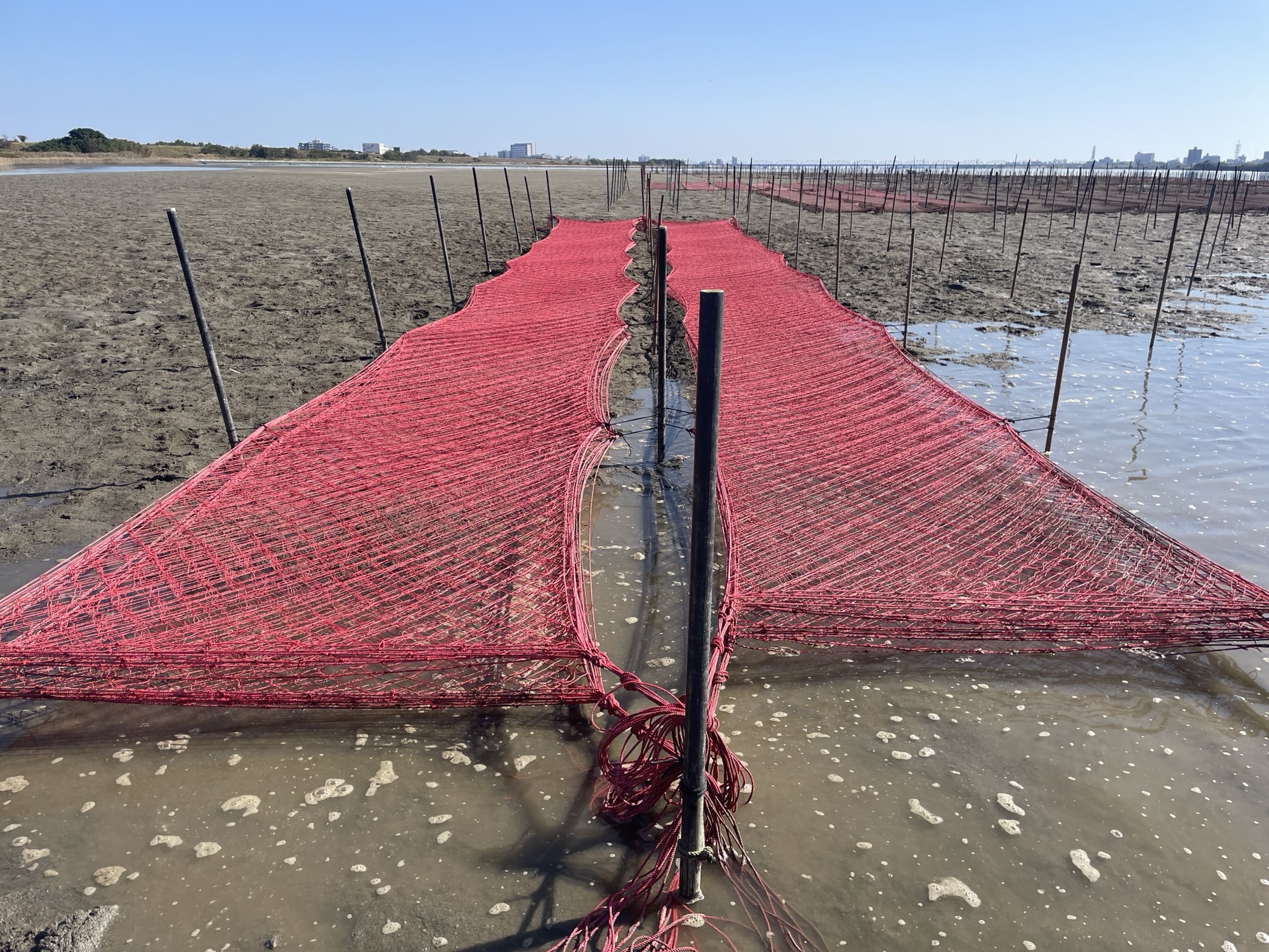 中洲の向こうに到着すると、赤く染めた網を広げ